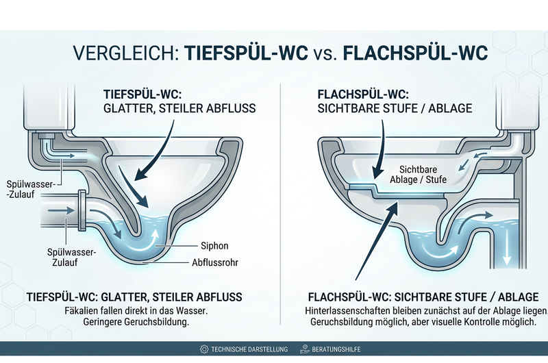 · Weniger hygienisch als Tiefspül-WCs